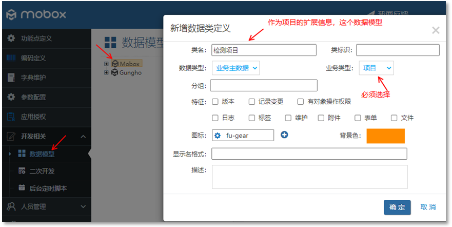 企業在實施項目管理系統的時候,不通類型的項目其屬性可能是不一樣的。而Gungho標準系統內對項目的屬性,主要包括(項目名稱、編號、開始結束日期等)。為了適應企業個性項目信息的輸入,我們需要通過Mobox平臺定義項目類型去適應這個需求