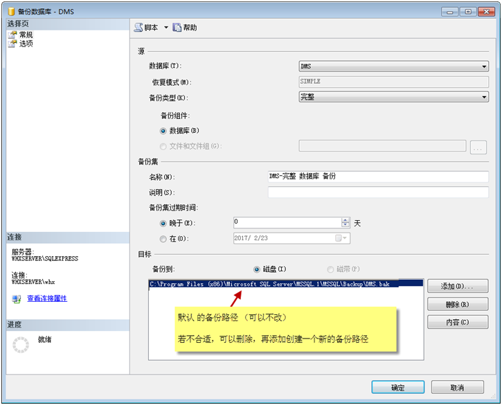 2)前面我們將mobox系統數據庫備份產生了?DMS.bak?文件,將這個文件拷貝到別的服務器,并以當天名稱加后綴,進行保存(如:DMS_20170222.bak).